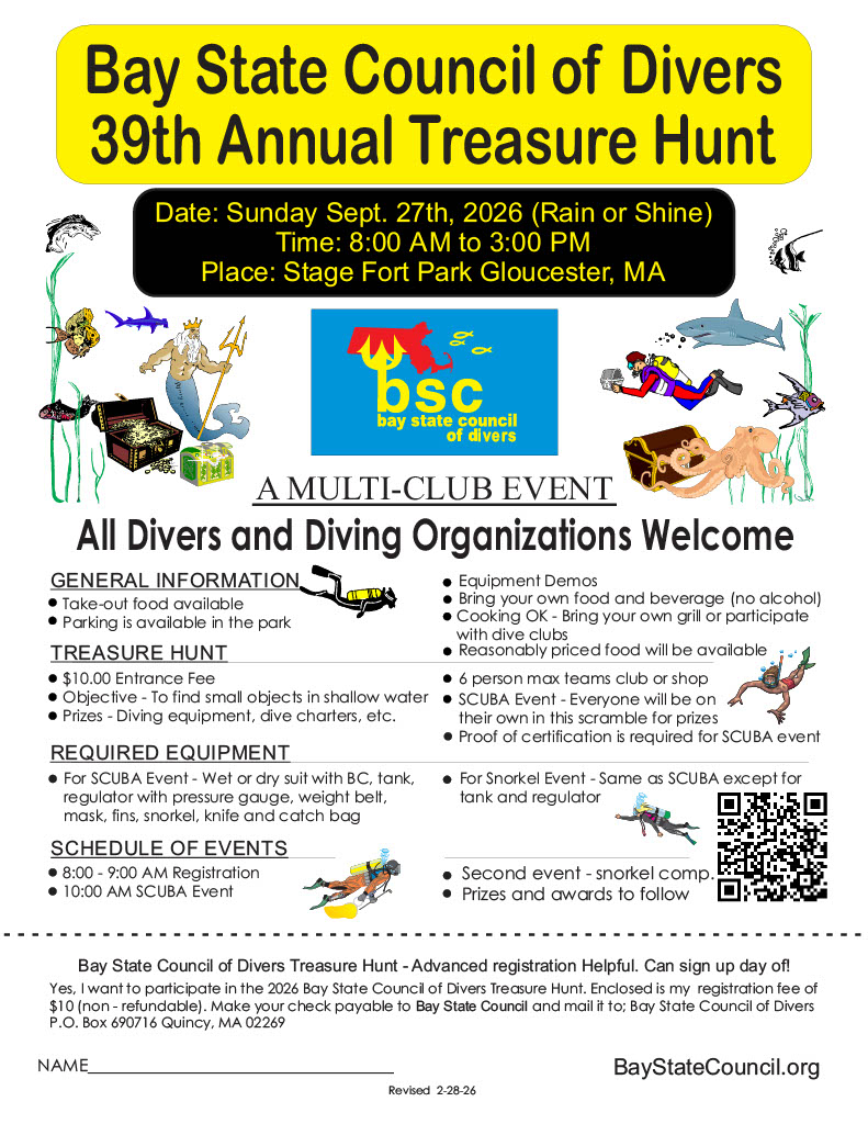 The annual Bay State Council of Divers (BSC) Underwater Treasure Hunt competition is our major fundraiser. It is an enjoyable family event providing an opportunity to meet new dive buddies, compete in a friendly environment and win prizes while supporting the Bay State Council of Divers. Although traditionally scheduled as an early-season event, this year we moved it into September, prime time for diving, to give us better weather and water conditions. It was a great time for the whole family. Photos from this and past Treasure Hunts are online for 2007, 2008, 2009, 2011, 2012, 2013, 2014, 2015, 2016, 2017 and 2018.